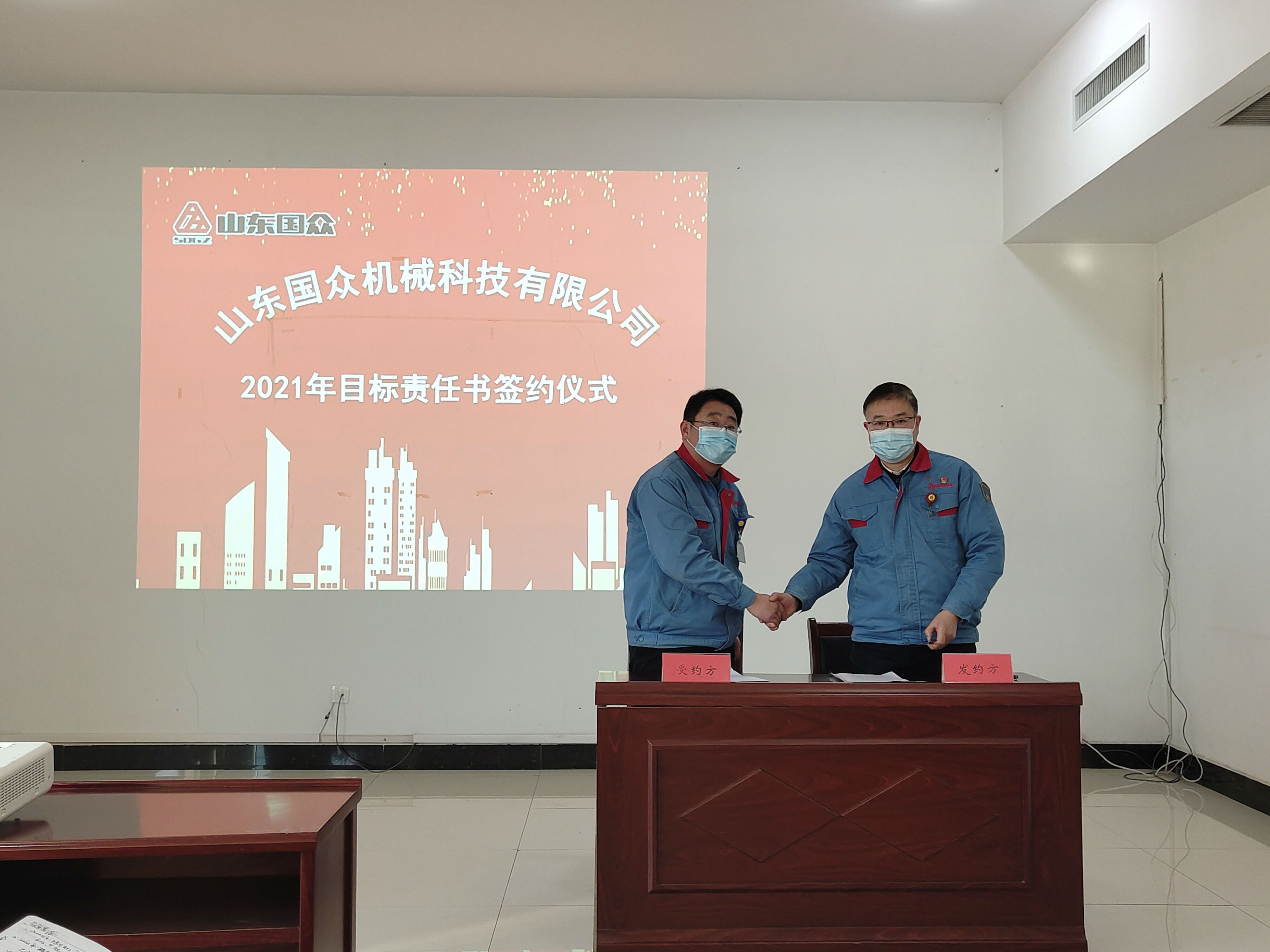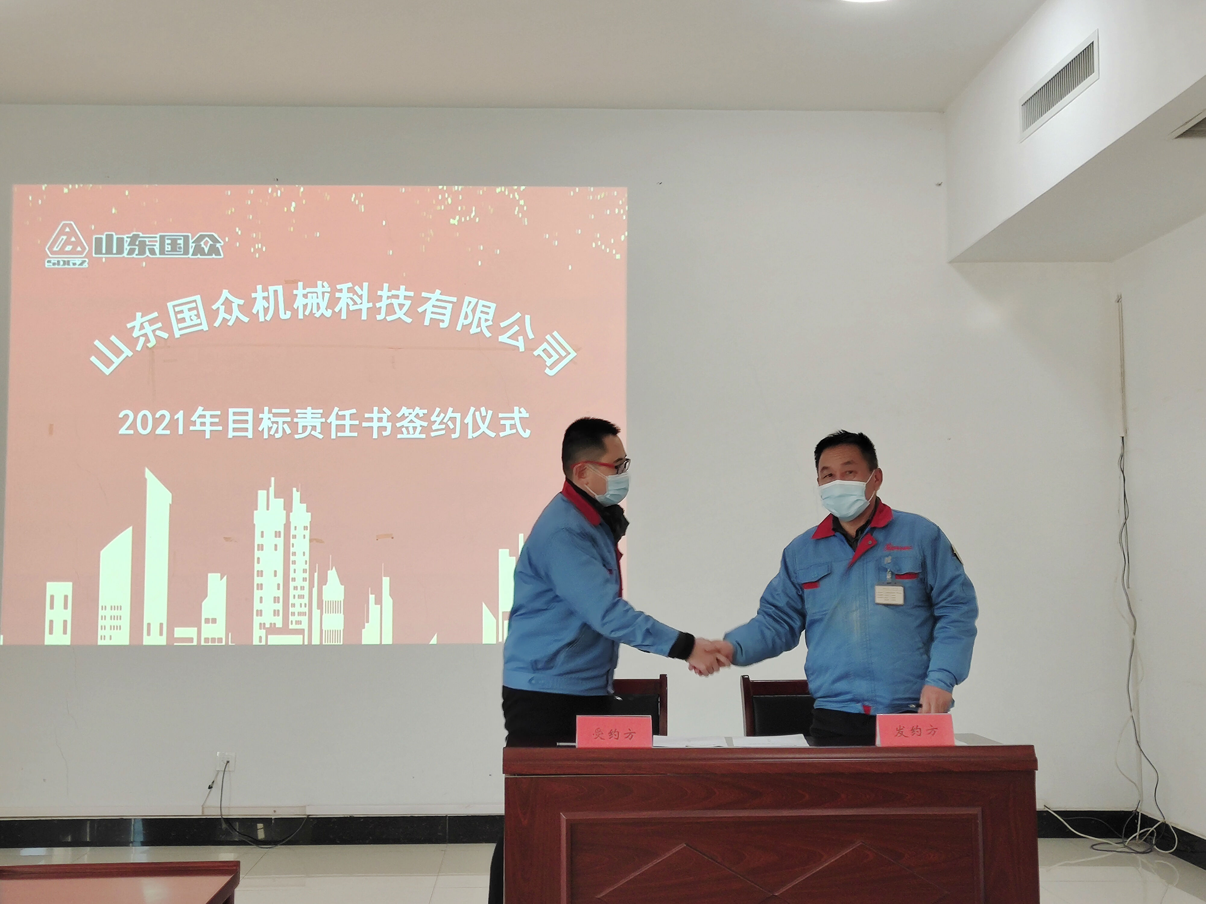 2021年1月19日下午,山東國眾在辦公樓一樓會議室舉行了 2021年度目標(biāo)責(zé)任書簽約儀式。公司領(lǐng)導(dǎo)、全體管理干部參加了此次簽約儀式,劉文吉常務(wù)副總經(jīng)理主持儀式。